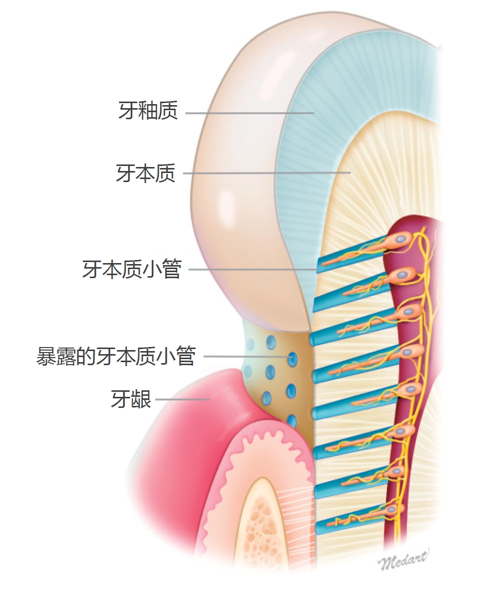 牙本质敏感(Dentinal Hypersentsitivity, DH)是指牙齿受到生理范围的刺激,包括机械、化学、温度、渗透压等时出现的短暂、尖锐的疼痛或不适的现象。牙本质位于牙釉质的下层,当这层较柔软的牙齿组织逐渐外露时, 就会导致敏感性牙齿。牙本质内的细微小管(也称为牙本质小管)不但含有神经末梢, 而且充满液体。这些细微小管比人类毛发宽度细小100倍,当这些牙本质的细微小管接触到冷或热刺激时,就会引起疼痛造成不适。当我们吃或喝一些热、冷或甜的食物和饮料时,都有可能导致牙本质小管内的液体流动,进而引起神经末梢产生反应,促使牙齿发生短暂而尖锐的疼痛。DH在成人中的发生率为4-74%,在口腔门诊患者中占1/7-1/4。40岁左右多见,男女无差别。