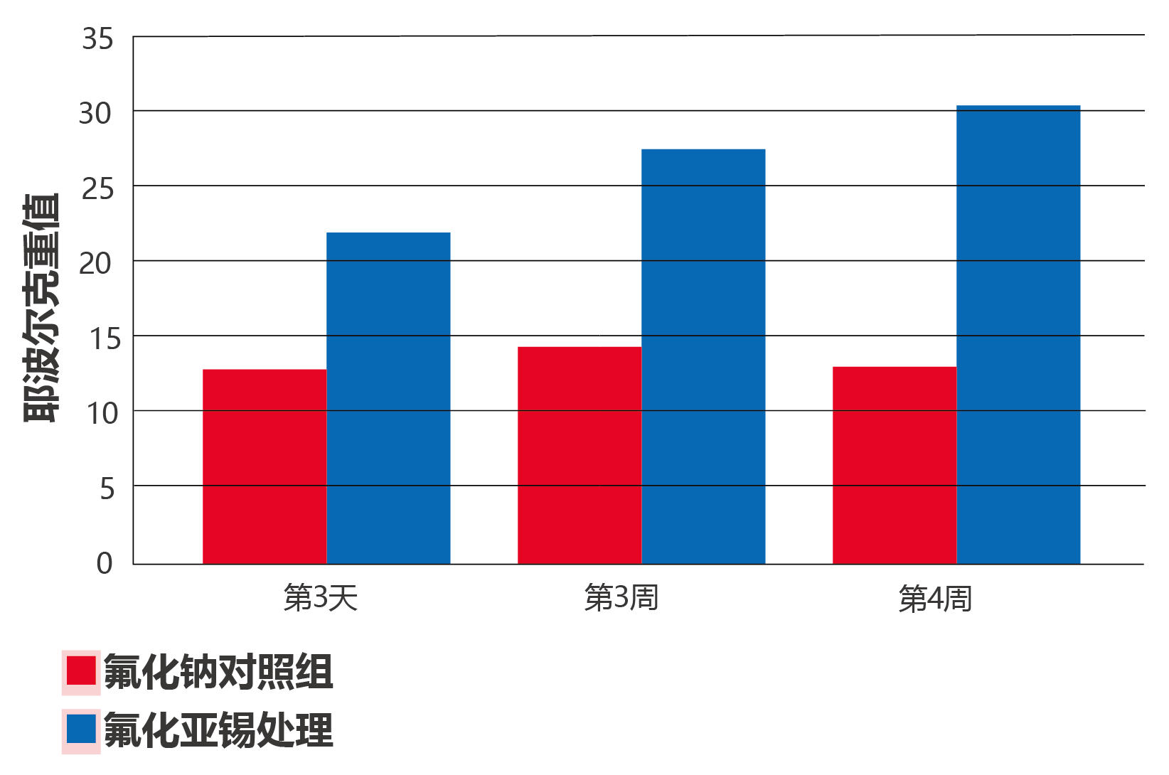 越高的数值指示了对于接触刺激越大的忍耐性,对比氟化钠控制组,经过氟化亚锡3天、3周和44周的处理,耶波尔克重值得到明显的提升,分别是22克、27.5克和10.5克。